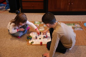 Eventually, he took out the cardboard “town” and set that up. He always talks about how he and I made that together when you guys lived here. You got into the act too. We each took cars and moved them along the roads, drove through drive-in restaurants and watched the hockey game on the UNH ice rink we drew. When your car went through McDonald’s you said “Can I have 50 million cheeseburgers please?”